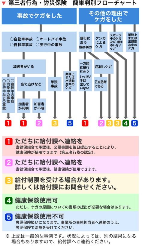 健康保険は、業務外の病気やけがに対して給付を行うもののため、勤務中や通勤途中でけがをした場合には労災保険の扱いになります。健康保険での給付を受けることはできません。